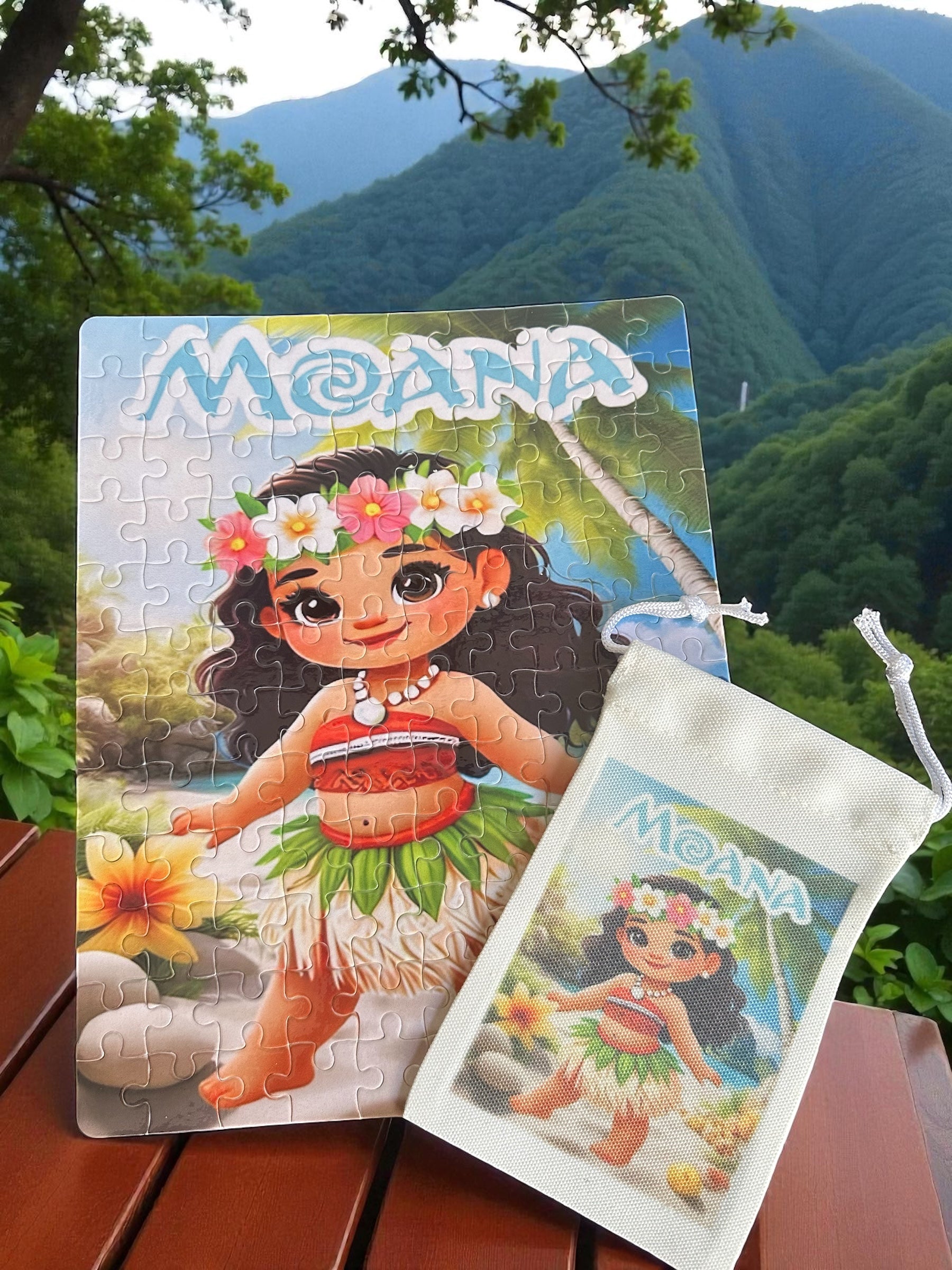 Moana puzzle in its perfect little bag for a birthday gift, the puzzle measures 7.87x9.84 inches and the bag 3.5x6 inches